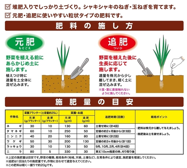 ねぎ・玉ねぎやにんにく・わけぎ・あさつき・らっきょうを元気に育てる、専用有機入り肥料です。玉ねぎ、ねぎ類に必要なリンサン高設計です。