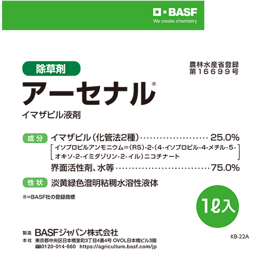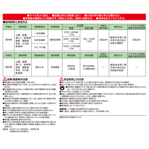 アーセナル®液剤は、散布時期を選ばない画期的茎葉兼土壌処理除草剤です。一年生雑草、多年生雑草をはじめ雑灌木や落葉樹類などを含めて、幅広い雑草木に優れた殺草効果を発揮し、およそ6ヶ月から1年の長期に渡り、雑草木を抑制する効果を兼ね備えています。アーセナルは、大きく成長している雑草や、これから発芽しようとする雑草を、広葉雑草からイネ科雑草を問わず、同時に防除します。特に難防除雑草とされるスギナ、クズ、ススキ、ササ、セイタカアワダチソウにも幅広く優れた効果を発揮します。効果発現まで2週間程度、その後効果完成までには1ヶ月以上を要します。使用にあたっては、周辺の有用作物への飛散・ドリフト・流入に注意し、樹木の根茎から3m以上離して散布してください。