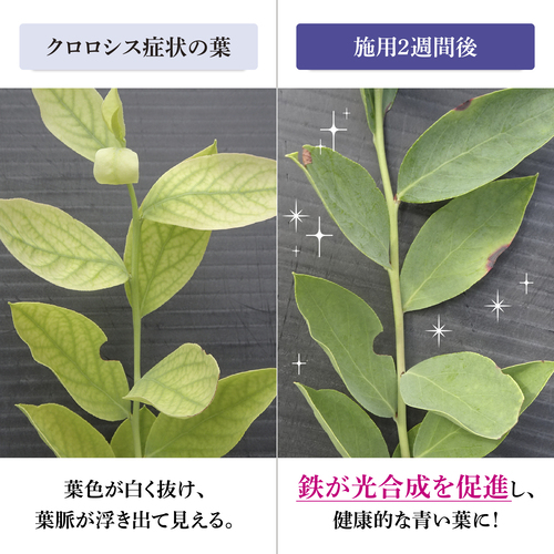 鉢土などに鉄成分を供給します。フルボ酸の効果で、根張りを良くします。クロロシスによる光合成の阻害を予防します。