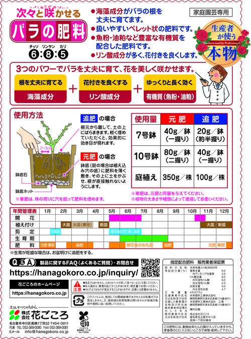 海藻成分がバラの根を丈夫に育てます。扱いやすいペレット状の肥料です。魚粉・油粕など豊富な有機質を配合した肥料です。リン酸成分が多く、花付きを良くします。