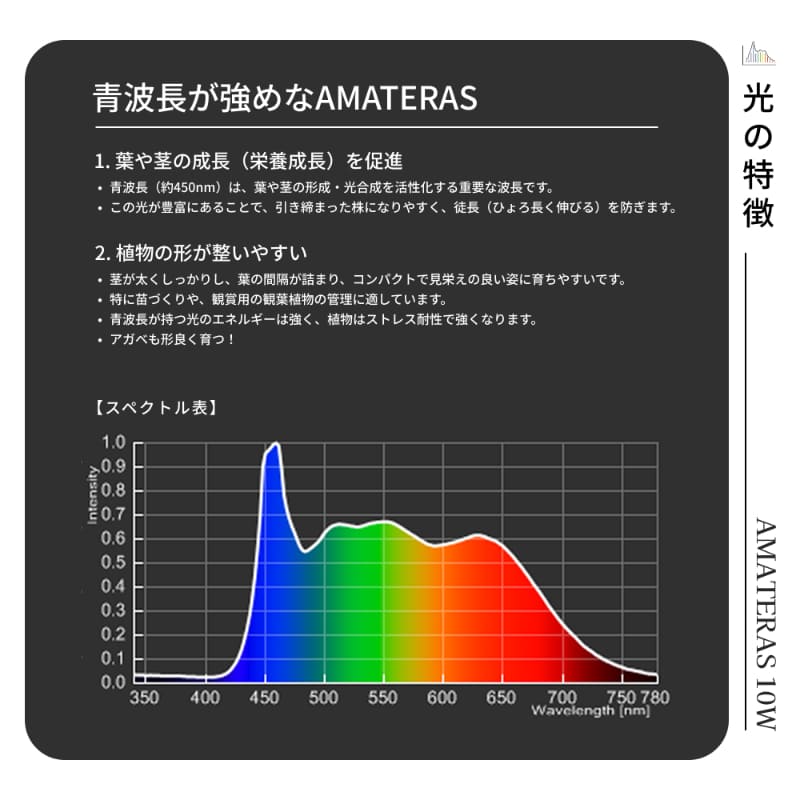 AMATERAS(アマテラス)は、植物育成のスペシャリストKumanomi360さんの監修の元誕生した太陽光に近い波長を使用した植物育成ライトです。太陽光に含む可視光七色全てを、連続性を持たせて発光し、演色評価指数もRa96を実現し、太陽とほぼ変わらない見え方で、植物を照らし、より自然に鮮明な見え方を実現しました。