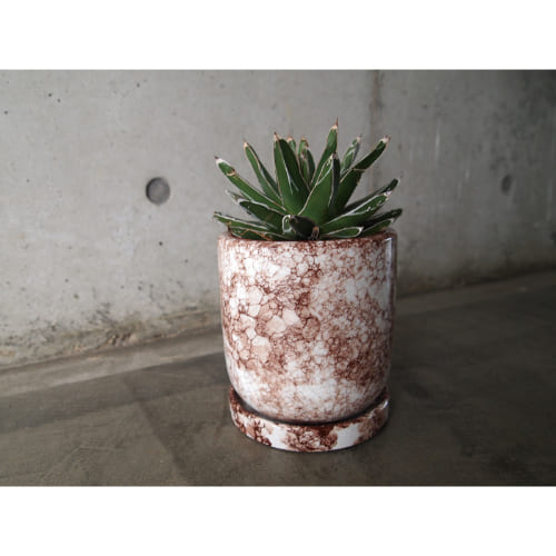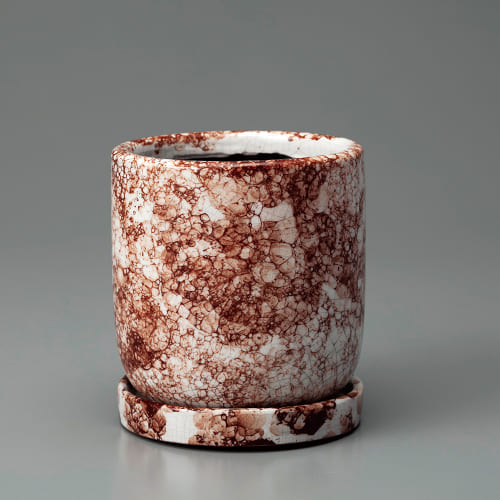 伝統的な赤土で作られた、重厚感のある陶器鉢。表面にクラックや色ムラをつけ、古びた風合いに仕上げています。