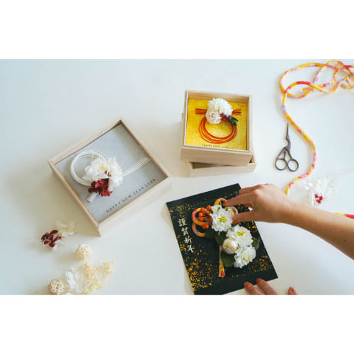 花材の量や余白の心配がなくなる、メッセージ付きのアレンジ用カードです。別売りの桐の器スタンドや桐箱と組み合わせて、季節感やイベント感のあるギフトへ仕上げることが可能です。
