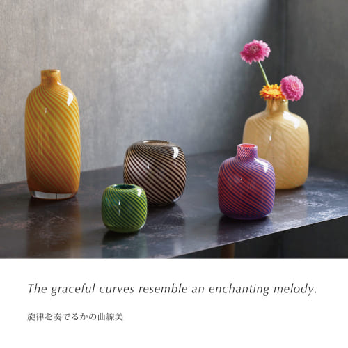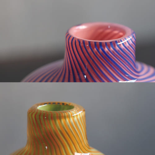 キャンディーのように艶やかで甘い色彩のガラスに、ぼやけすぎないようにストライプで引き締めた重厚感のあるガラスの花器です