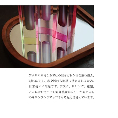 シンプルなフォルムでありながら、置かれた空間をまるで舞台のように彩り、静かに揺らめく光と色彩の魔法を感じさせます。