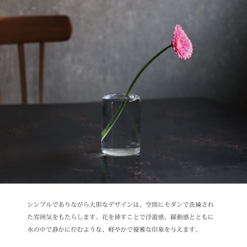 水を満たすことで、一つの美しい水の円柱が姿を現すようなデザインの花器です。透明感あふれるガラスと水が一体となり、花を引き立てながらもインテリアとして存在感を放ちます。シンプルでありながら大胆なデザインは、空間にモダンで洗練された雰囲気をもたらします。