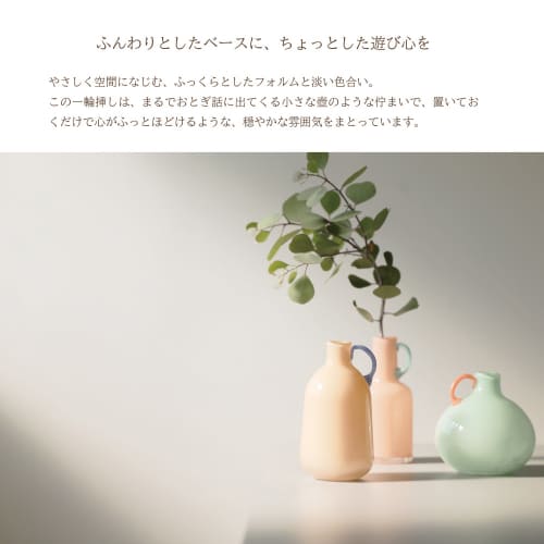 やさしく空間になじむ、ふっくらとしたフォルムと淡い色合い。まるでおとぎ話に出てくる小さな壺のような佇まいで、置いておくだけで心がふっとほどけるような、穏やかな雰囲気をまとっています。思わず手に取りたくなるような“くねっ”とした取っ手。