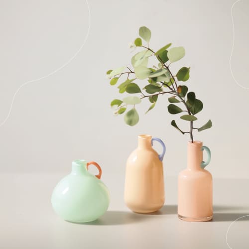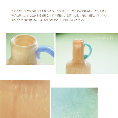 取っ手の曲線やボトルネックの長さも、それぞれ微妙に違っていて、手作業のようなあたたかさを感じさせます。