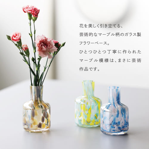 花を美しく引き立てる、芸術的なマーブル柄のガラス製フラワーベース。