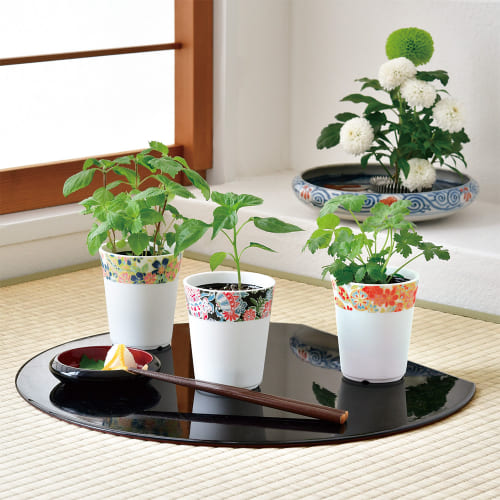 友禅染めの晴れ着を思わせる華やかな和柄をデザインした陶器製の器で、日本の薬味を育てます。