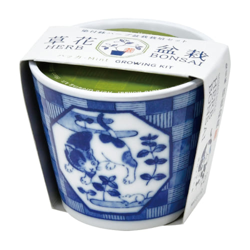 藍色の染付鉢で、盆栽風にハーブを育てます。