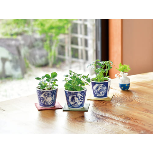 藍色の染付鉢で、盆栽風にハーブを育てます。