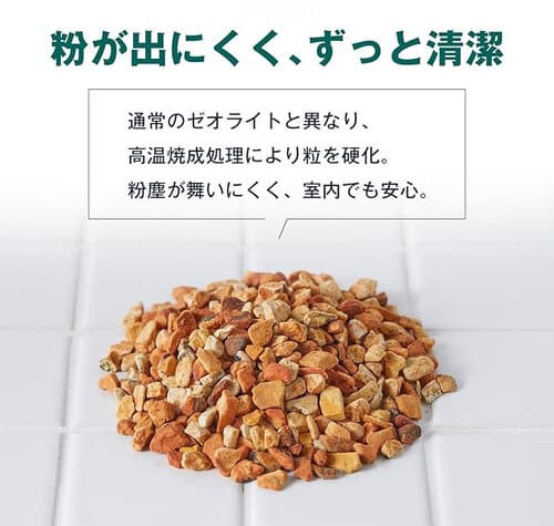 2. 独自のデザイン高温焼成で、ずっと清潔 独自の高温焼成処理を施すことで、粒を硬化させています。通常のゼオライトに比べて耐久性が高く、粉塵が舞いにくいため、室内を汚さず清潔に保つことができます。